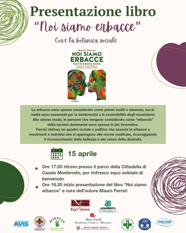 Dopo la passeggiata, il gruppo si è recato al casotto della Cittadella che ora è la sede della sezione FIAB monferrina e dove Mauro Ferrari, cremonese formato all’Università Cà Foscari di Venezia, specializzato nella formazione di agenti di sviluppo operanti per il welfare generativo e docente alla Scuola universitaria professionale della Svizzera italiana, ha illustrato il concetto di “botanica sociale” che ha presentato nel libro intitolato Noi siamo erbacce.
